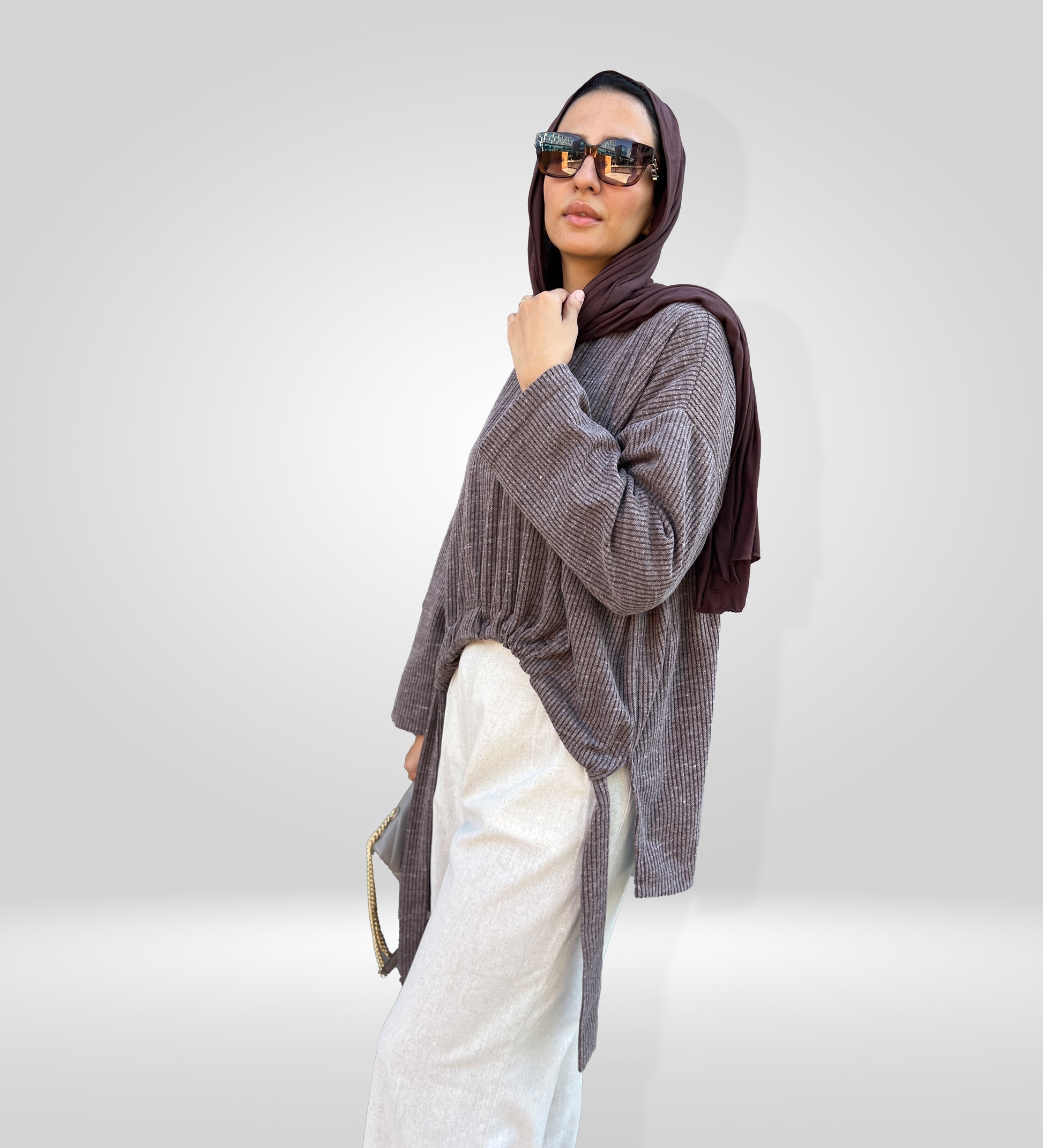 An asymmetric ripped wool sweater with a gathered curve at the low front and a longer, straight back. Its raw texture and sculpted shape offer a bold yet effortless layering piece.