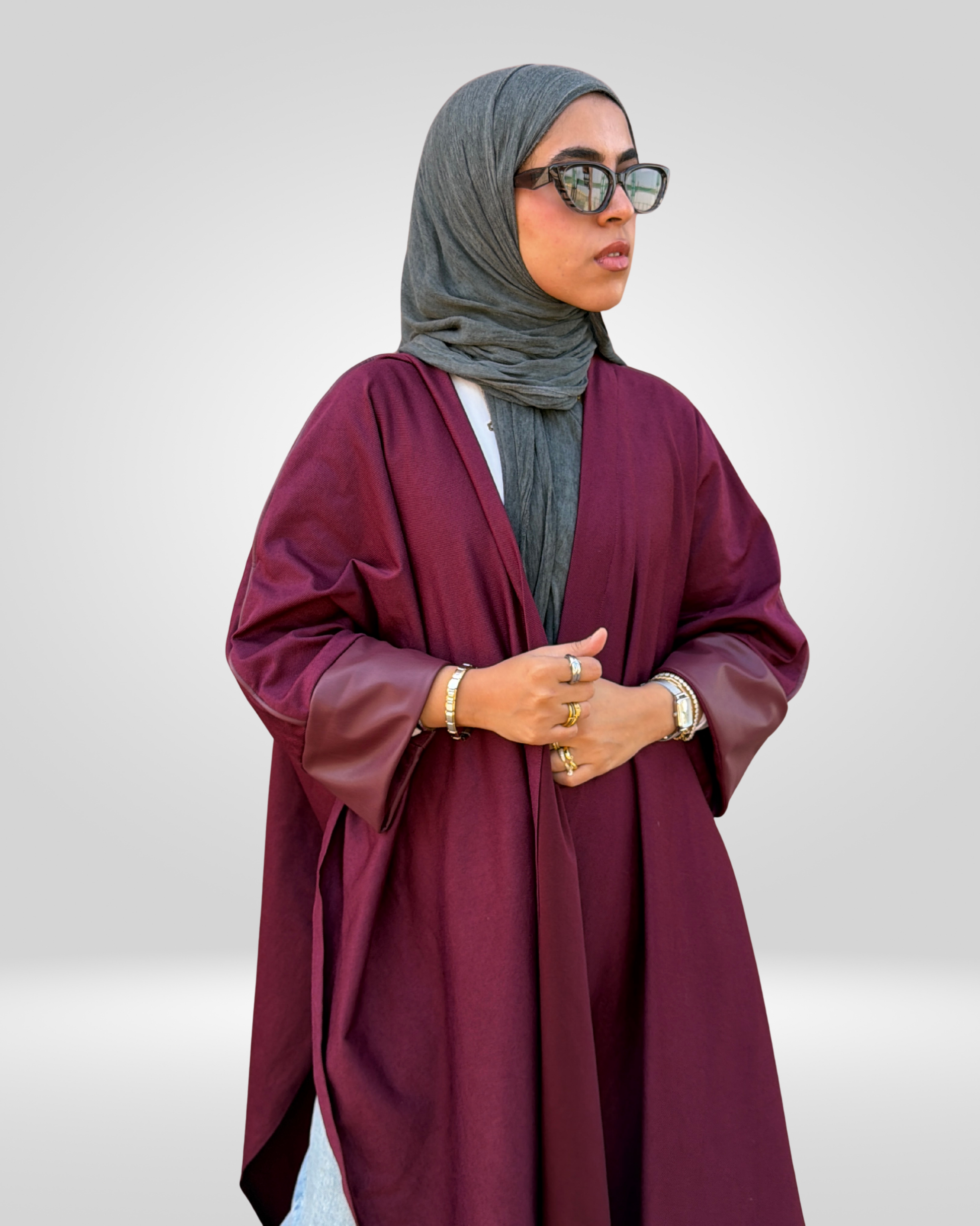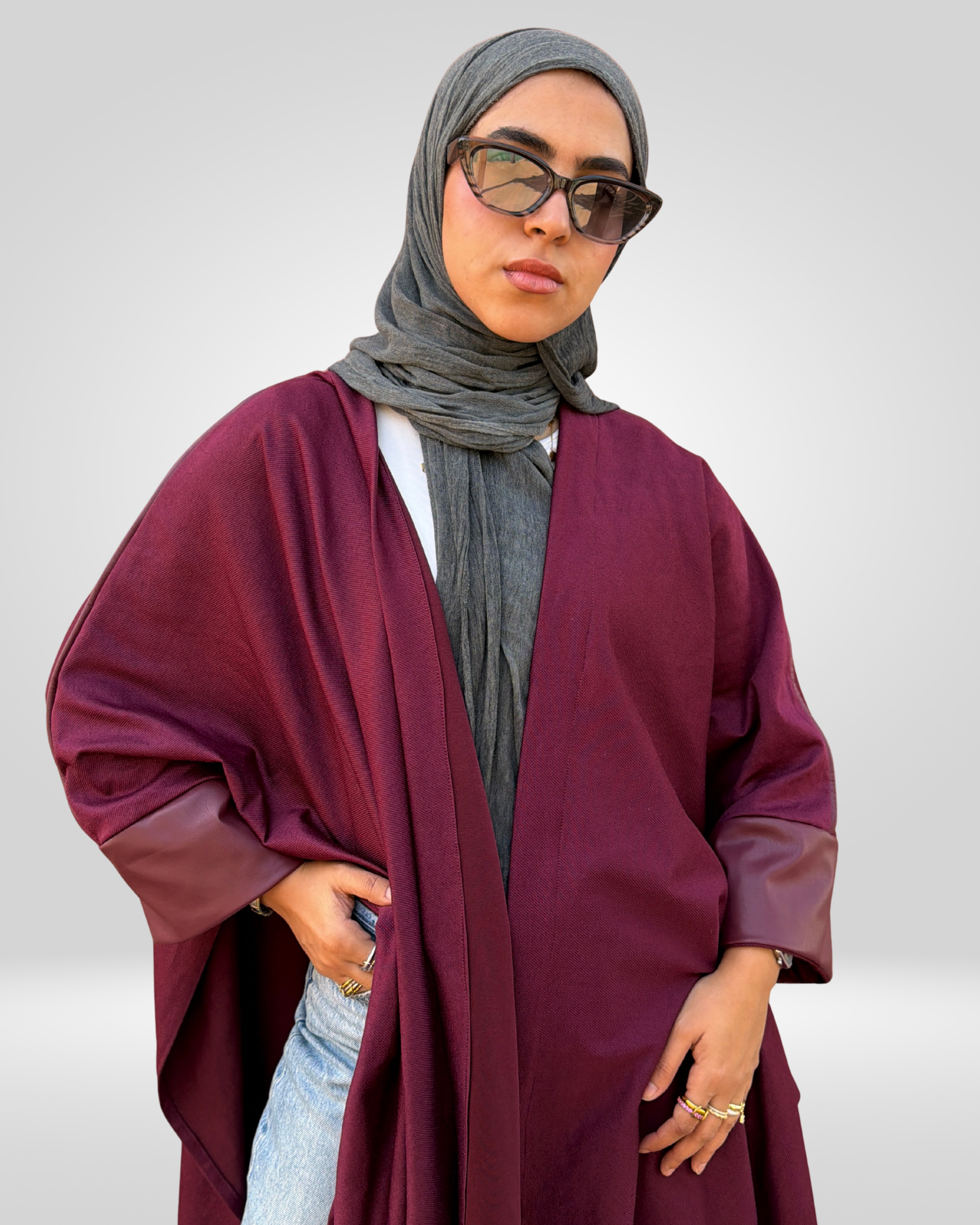 A refined velvet cape designed in a rich burgundy tone, elevated with leather-trimmed sleeves and a defined outlined finish. The open-side construction and mid-length silhouette create graceful movement, making it a standout layering piece for sophisticated evening styling.