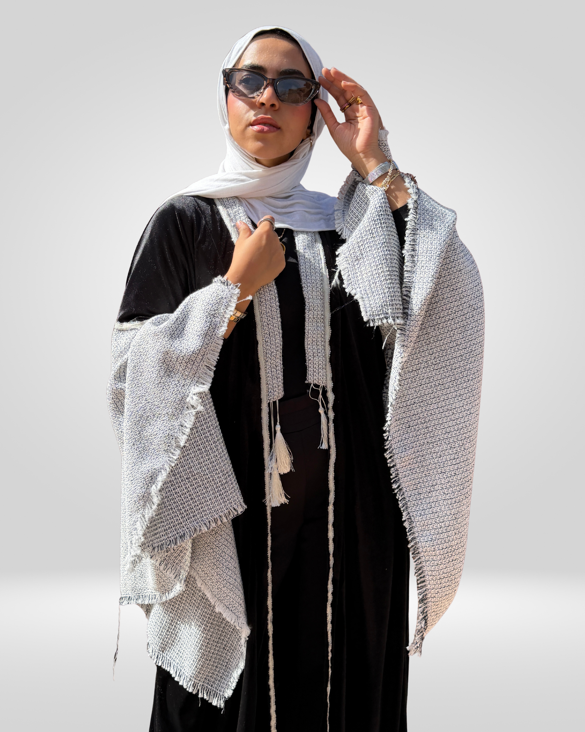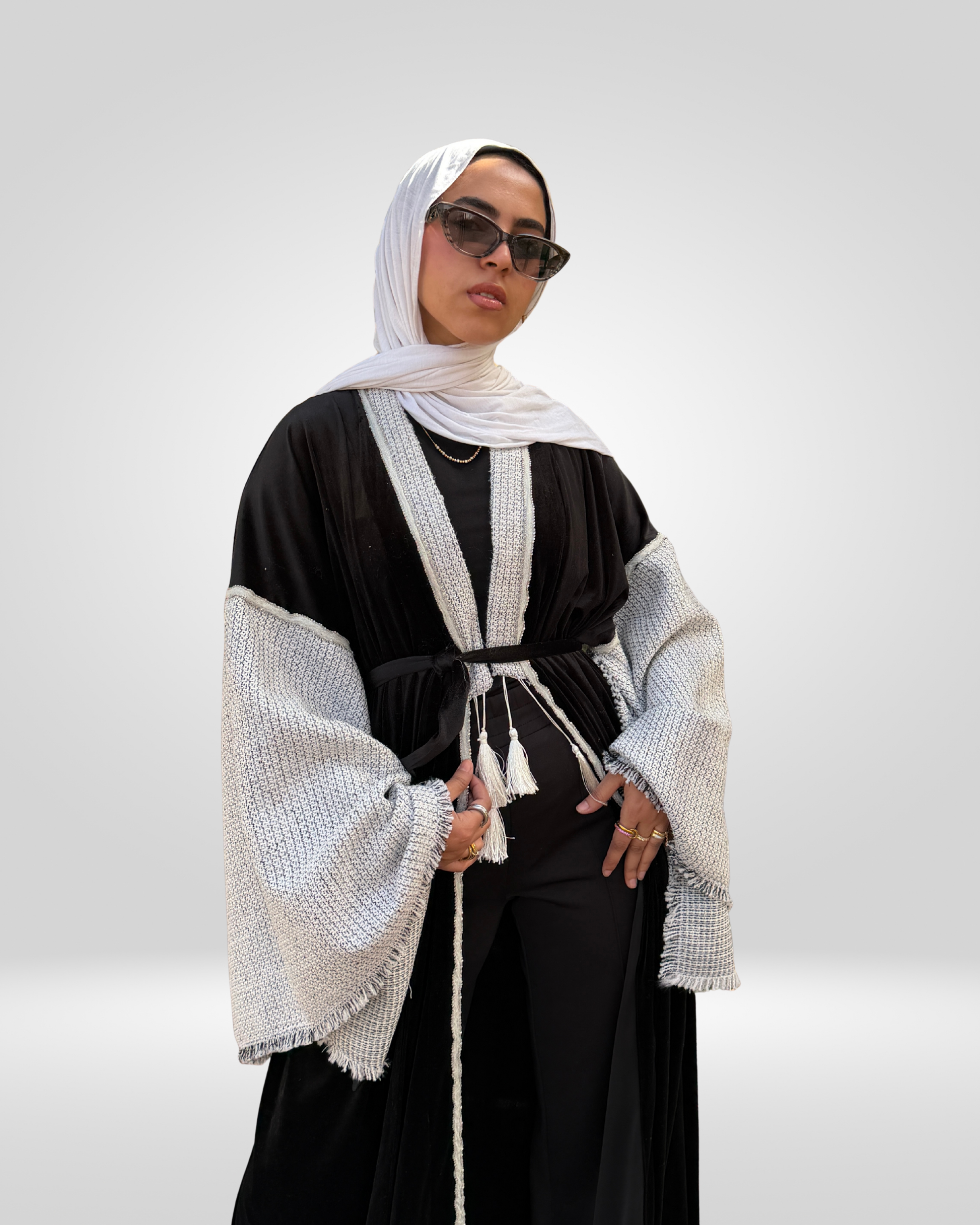 A black French velvet kaftan with an abaya‑inspired silhouette. It features a slim black‑and‑white collar with a soft hint of sparkle. The wide sleeves add a graceful, flowing effect, making it an elegant choice for evening wea.